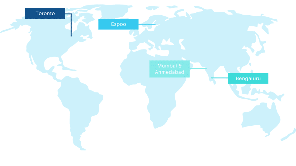 Our office team is located in Espoo and the wider Uusimaa area. Our sister company has offices in Ahmedabad, Mumbai, Bengaluru and Toronto.